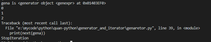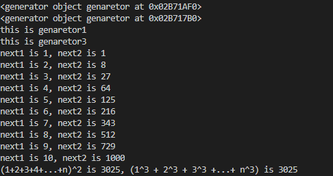 首选,print打印的gen1,gen3都是一个生成器,如之前所说,我们可以用next()函数执行遍历,next1和next2的值就是next()调用生成器的结果