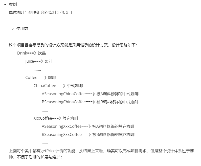 2. 装饰模式会导致设计中出现许多小类,如果过度使用,会使程序变得很复杂。