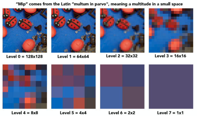 Mipmap就是从一张图生成一系列图,例如有一张纹理为128*128,称之为第0层纹理,我们可以生成更多更高层的纹理,每一层都是上一层缩小到一半的结果。例如第0层为 ,第一层为 ,第二层为32*32,直到最后变成一个像素,这样一共就有log层。