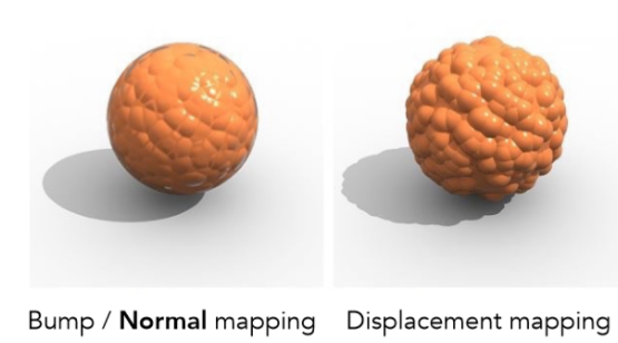 Bump Maps是逻辑上的高度改变,而Displacement Maps则是物理上的高度改变,二者的区别就在此处,可以通过物体阴影的边缘发现这点: