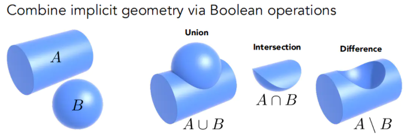 另外一种表示方法是CSG (Constructive Solid Geometry, Implicit) 表示方法,它是通过基本几何的基本运算来定义新的几何,例如一个圆柱和球,做布尔运算,通过几何之间的求交集、叉积和并集就能得到新的较复杂的几何