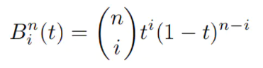 总结归纳,给定n+1个控制点,我们可以得到一个 阶的贝塞尔曲线,它在任意时间t都是给定控制点的线性组合,它组合的系数是一个跟时间有关的多项式,这个多项式叫做Bernstein多项式