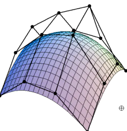 对于下图所示的曲面,可以理解成由一个平面,施加一个向上的力,拖拽上去得到的结果,它是由个控制点得到的,图中的黑点可以理解为拖拽时施加力的作用点。