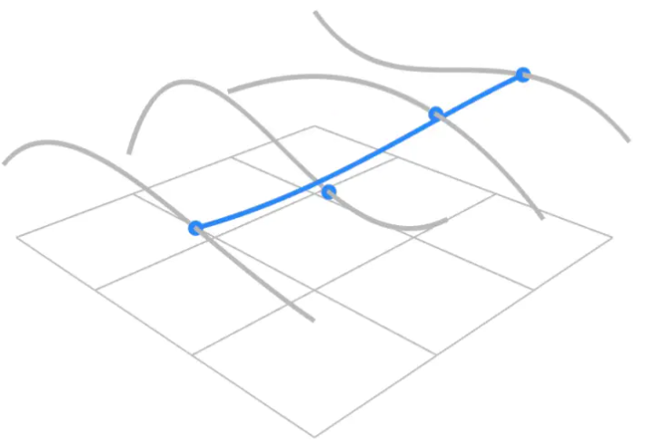 首先在平面上定义个控制点,它有行列,先从行来看,这四根曲线上的点在不同的时间有不同的位置如果我们把这四个曲线上的控制点,认为是另外一个方向的贝塞尔曲线的控制点,我们就可以画出这条贝塞尔曲线,在这根线不断地扫掠地过程中就可以得到一个曲面。通过这种方式我们可以定义非常复杂的曲面。