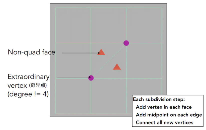 这样的细分会在每一个非四边形面上引入一个奇异点,并且会将这些非四边形面转换为四边形面。Catmull-Clark Subdivision会在第一次细分后,增加了非四边形面的数量个奇异点,之后不再增加。