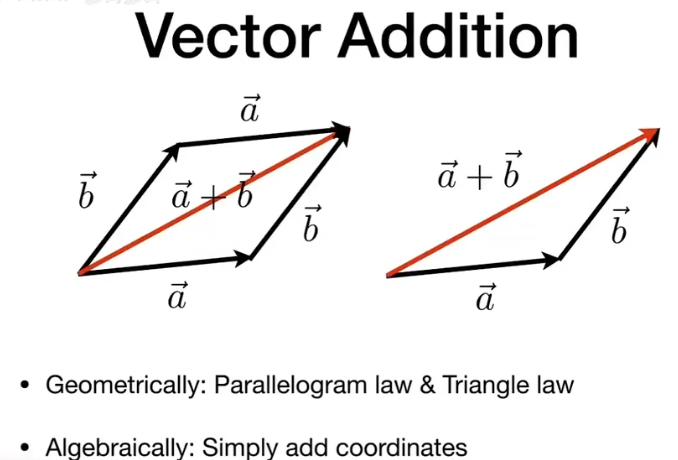 向量相加在几何上一般使用平行四边形法则和三角形法则,在代数上则是简单的各分量相加