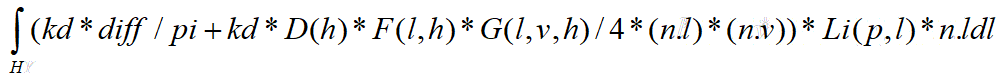 可以简单地理解为,在法线为轴的半径所环绕的半径域上,所有入射光的辐射率,乘上角度的衰减,乘上BRDF函数的约束,也就是f(l,v)