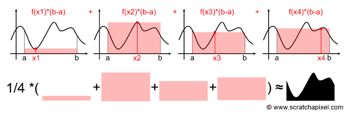 讲解推导:https://www.scratchapixel.com/lessons/mathematics-physics-for-computer-graphics/monte-carlo-methods-in-practice/monte-carlo-integration?url=mathematics-physics-for-computer-graphics/monte-carlo-methods-in-practice/monte-carlo-integration