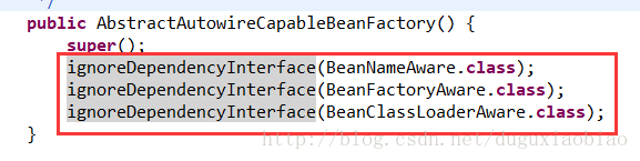 我们到 super(parentBeanFactory); 这个方法中,可以看到有一个操作, ignoreDependencyInterface(.....class)操作