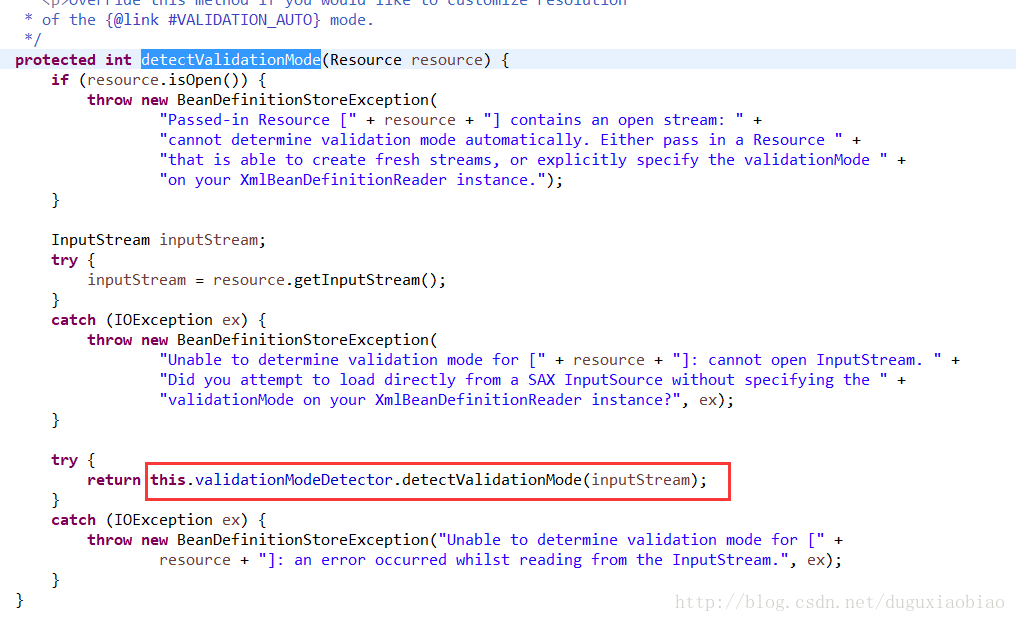 在加载xml之前,有一步骤很重要,那就是判断该xml是基于 xsd 还是 dtd 方式,进入到 getValidationModeForResource方法中可以看到