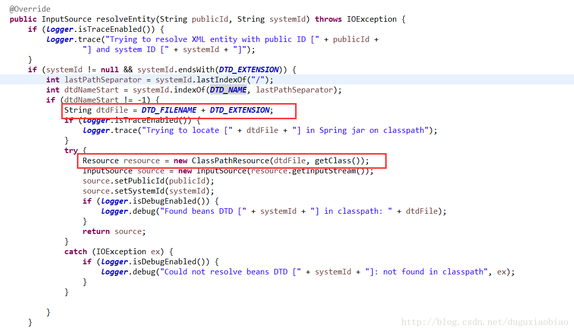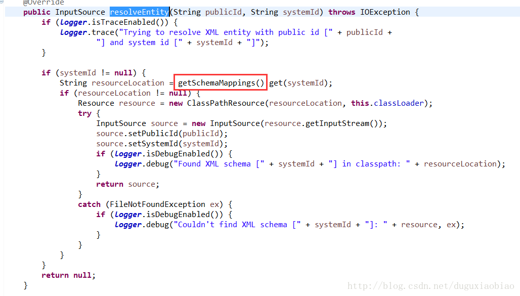 如果是XSD,则会调用 PluggableSchemaResolver类的 resolveEntity()方法来解析,我们可以看到解析过程如下