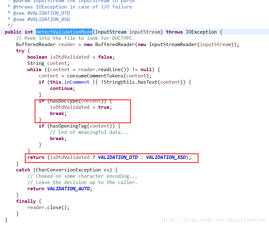 在这个方法中,我们可以看到 如何判断 XML验证是 DTD还是XSD的,说白了就是判断是否是 DOCTYPE 开头的,如果是,那么就用 DTD方式 否则就是 XSD。