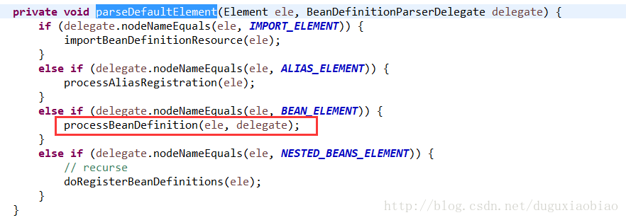 该方法将获取 beans下的所有元素,遍历,判断是否是默认标签元素,默认标签元素有:import、alias、bean、beans等,如果是默认元素,则调用 parseDefaultElement()方法,否则调用自定义元素的解析方法即 parseCustomElement()。下面对默认元素解析以 bean元素解析作为解析,其他大同小异