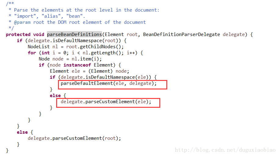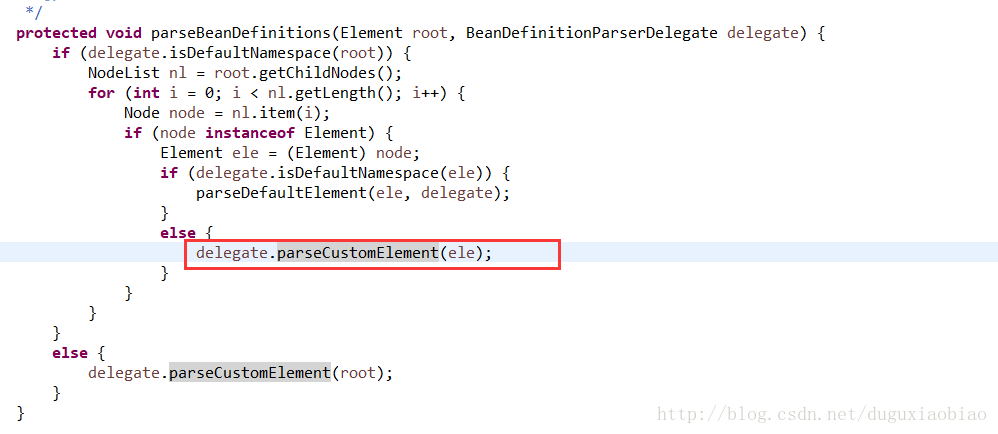 下面跟着进入 parseBeanDefinitions()方法中