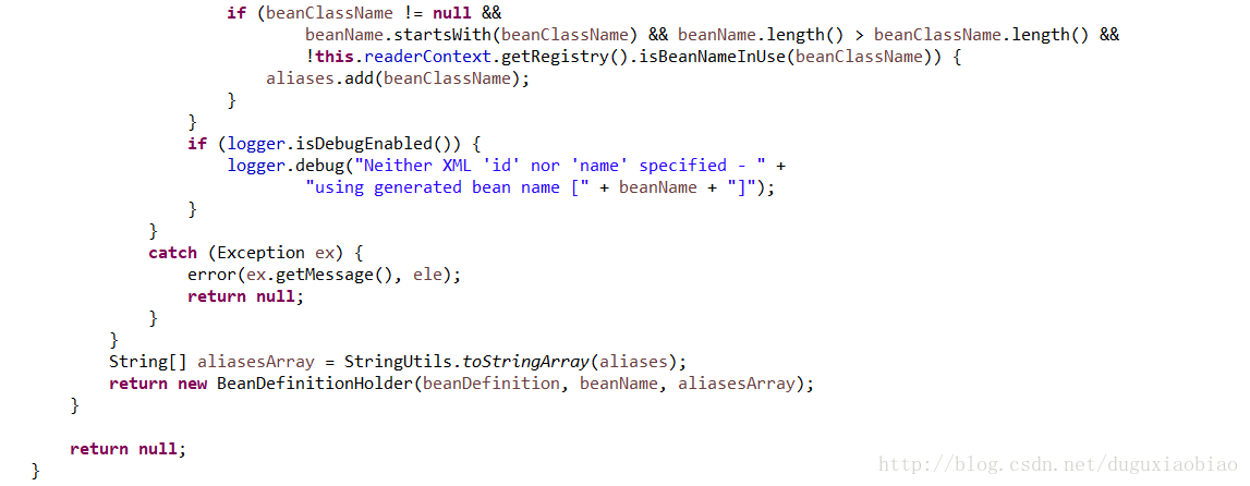 第一,获取id和name属性,如果存在id,则 beanName = id,否则没有id只有name的话,就用beanName=别名中的第一个。