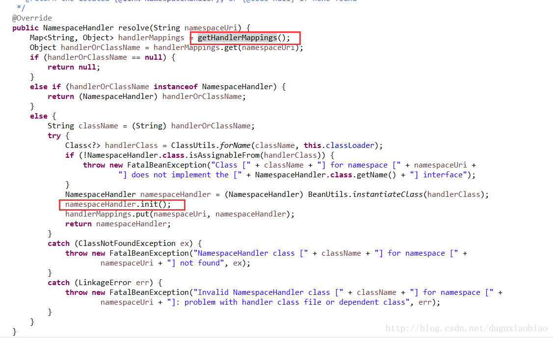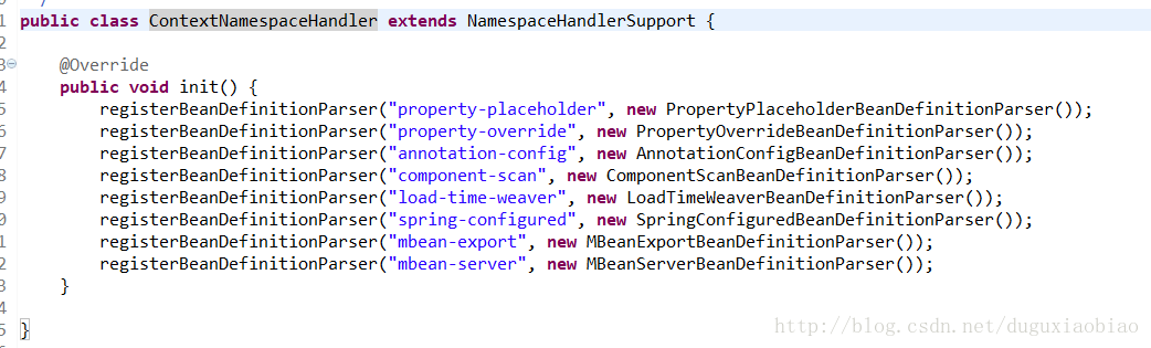 然后通过 context标签对应的uri找到 ContextNamespaceHandler类,这个类中只有一个方法 init(),那么该方法什么时候调用呢,我们继续看,下面的代码中调用了 init()方法,所以 我们看 ContextNamespaceHandler类中的 init()方法。