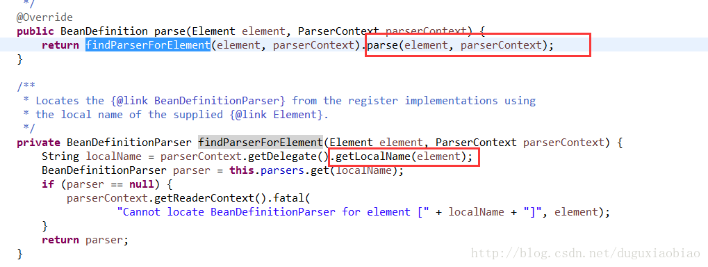 刚才我们通过init方法注入了多个解析器,但是 对于 context:component-scan这个标签有自己的解析器,怎么找到这个解析器呢,就通过以上方法,根据 getLocalName方法获取到 component-scan,然后根据这个key找到 解析器