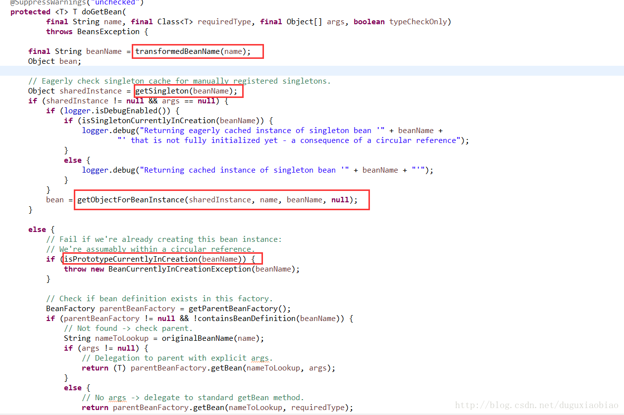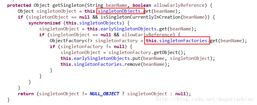 可以很清楚的看到 显示在 单例的缓存中尝试获取,获取不到就可能在FactoryBean的缓存中,再次获取,如果获取到了通过getObject()方法获取对象,获取不到,则返回null