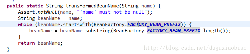 (1)转化beanName,这是什么意思呢,可以通过下图源码中看到如果是 以 “&”开头的要截取掉,这就是当如果我们的bean是FactoryBean类型的bean的情况下做得准备。前面也说了如果是FactoryBean类型的bean获取时需要添加 &。
