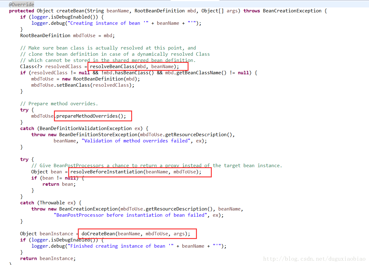 这方法主要针对aop存在的,有关aop后面的文章中会介绍到,这里主要说下,我们在创建bean的时候可能不是获取真实的实例的,可能通过aop方式,创建基于jdk或cglib代理的代理对象,这个方法就是如果通过aop创建了一个队里对象的话,就不会继续执行下去,直接返回代理对象,否则继续执行第四步