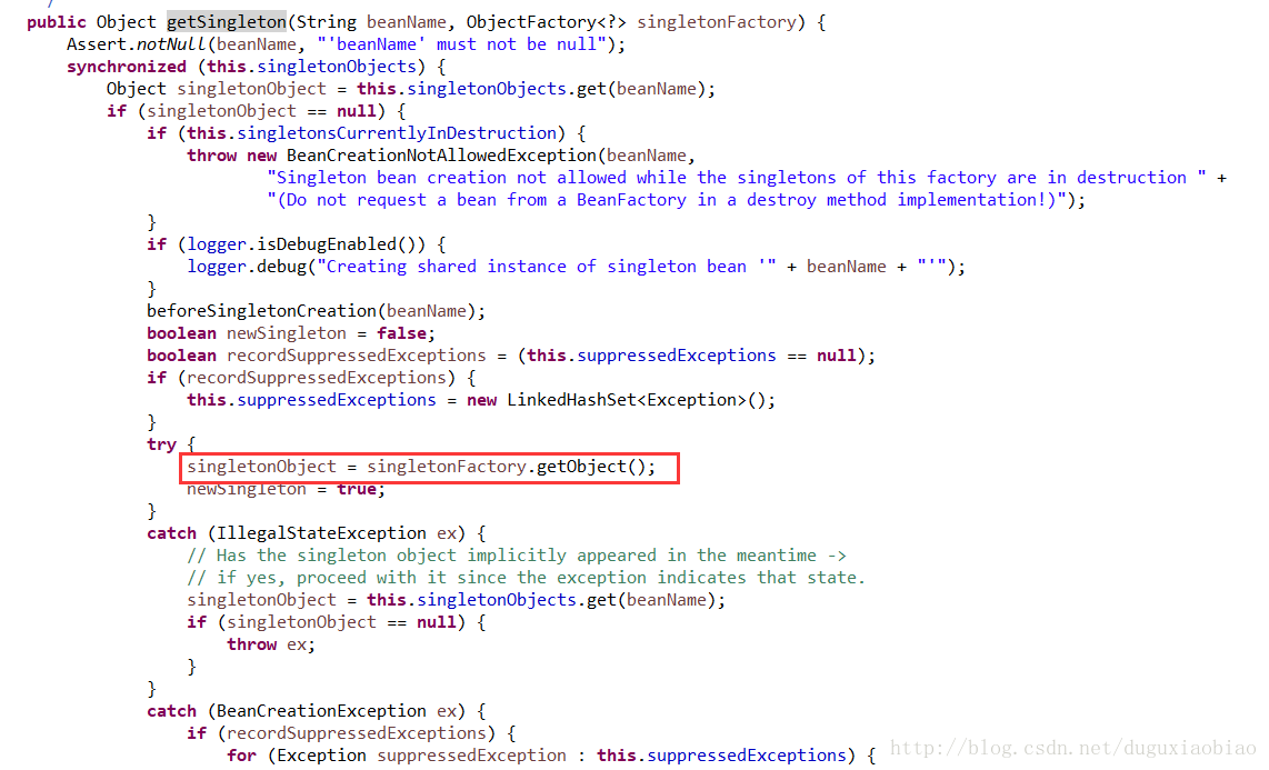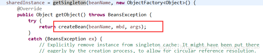 在这个方法里,其实就在创建的之前记录一下,在beforeSingletonCreation()方法中体现,然后就是调用 singletonFacetory的回调方法 getObject(),来创建bean,我们可以去看到该方法中只有一个createBean()方法