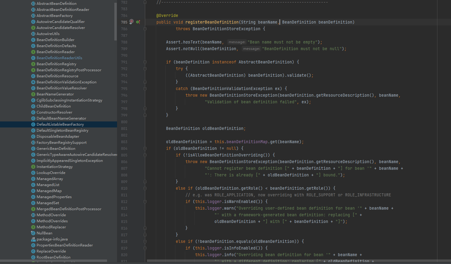 DefaultListableBeanFactory实现了BeanDefinitionRegistry接口的registerBeanDefinition(String beanName, BeanDefinition beanDefinition)方法, 其中包含了所有的注册逻辑。