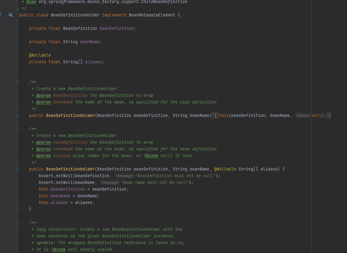 delegate最终把解析到的一个个的bean对象放在BeanDefinitionHolder对象里,BeanDefinitionHolder可以看到我们梦寐以求的beanDefinition属性,这也是最终需要放在beanDefinitionMap里的属性。