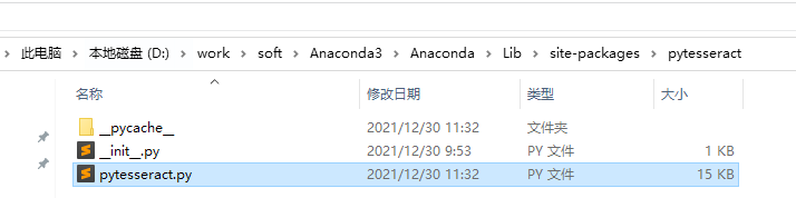 然后找到"pytesseract.py"这个文件,因为我这里安装的是"Anaconda",所以在这个文件夹目录下找,路径在这个位置: