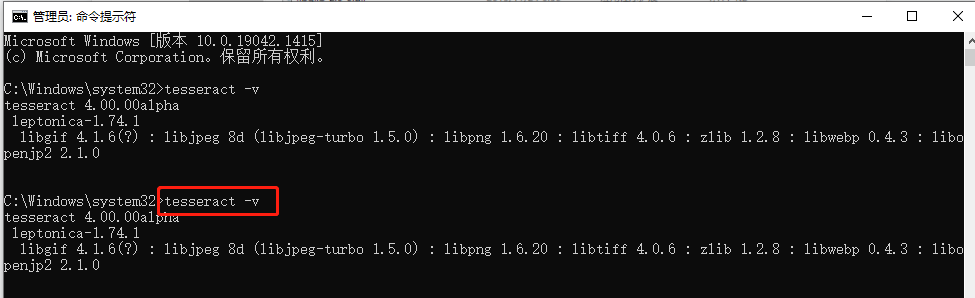 打开 cmd,输入命令 tesseract -v,看到输出版本信息即代表安装成功。