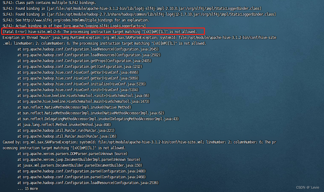 在写hive-site.xml配置文件时,执行后报错:The processing instruction target matching “[xX][mM][lL]” is not allowed.