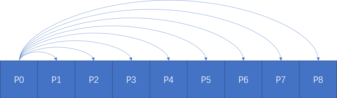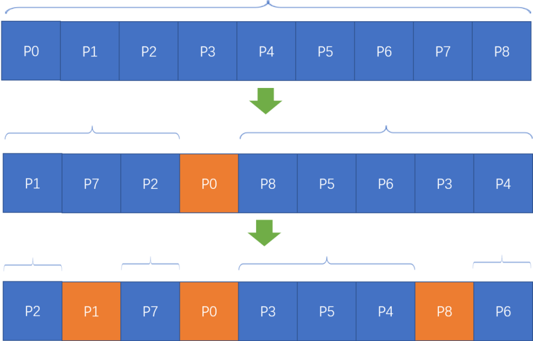 冒泡排序的原理很简单,就是一轮一轮地逐个比较,假设有9个像素值P0~P8,现使用冒泡排序对其进行从大到小地排序,排序过程分为8个步骤: