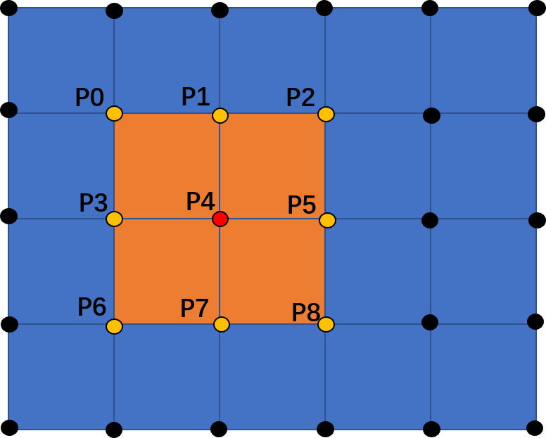 假设取3*3窗口进行中值滤波,如下图所示,P4为当前待滤波点,取其周围矩形区域中9个点的像素值进行排序,假设排序结果为:P0<P5<P7<P2<P3<P1<P8<P4<P6,那么则取P3的像素值作为P4的滤波值。