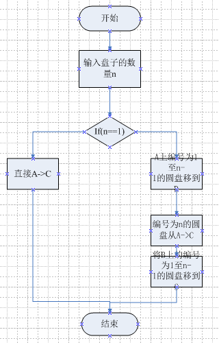 首先输入盘子的数量n,如果盘子的数量是1,则直接将编号为1的圆盘从A移到C,递归结束。