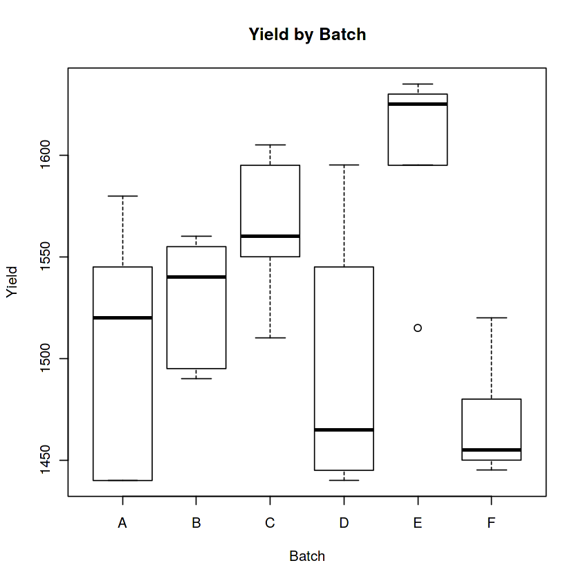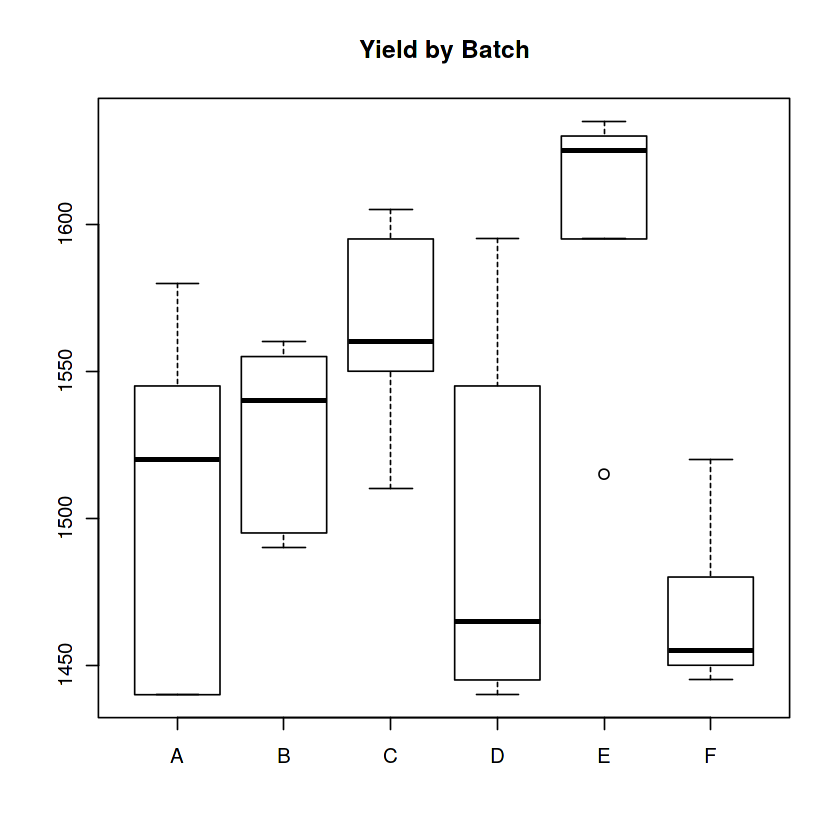 boxplot(Yield~Batch,data=dye.data,main="Yield by Batch")
