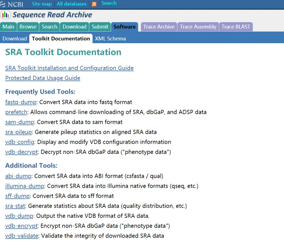 Toolkit Documentation : Software : Sequence Read Archive : NCBI/NLM/NIHhttps://trace.ncbi.nlm.nih.gov/Traces/sra/sra.cgi?view=toolkit_doc