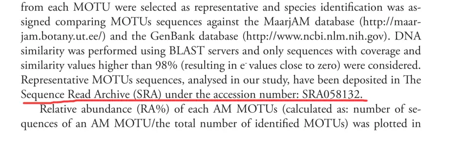 首先在文章中找到作者提供的SRA号,或者SRP号。有的习惯写在材料方法中,有的习惯写在文章的末尾的Acknowlagements里面。本次的例子写在方法里面,如图。