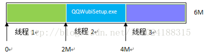 好,废话多了,现在进入正题,所谓多线程下载就是对同样的一个文件,使用N(0,1,2....)个线程去下载这个文件,这样就很好的提高下载效率。例如一个6M的文件,如果我使用单线程下载可能需要的时间30s,该线程所承担的下载任务为6M,但在相同的情况下如果使用三个线程下载,那么每个线程所承担的任务就是2M,下载的时间将会缩短到10s,这样一来就节省了大把时间。如下: