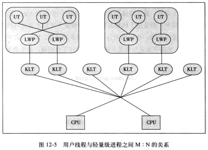 在这种混合模式下,即存在用户线程,也存在轻量级进程。用户线程还是完全建立在用户空间中,因此用户线程的创建、切换、析构等操作依然廉价,并且可以支持大规模的用户线程并发。而操作系统提供支持的轻量级进程则作为用户线程和内核线程之间的桥梁,这样可以使用内核线程提供的线程调度功能及处理器映射,并且用户线程的系统调用要通过轻量级进程来完成,大大降低了整个进程被完全阻塞的风险。这种混合模式,用户线程与轻量级进程的数量比是不定的,即N:M的关系,也称为多对多的线程模型。