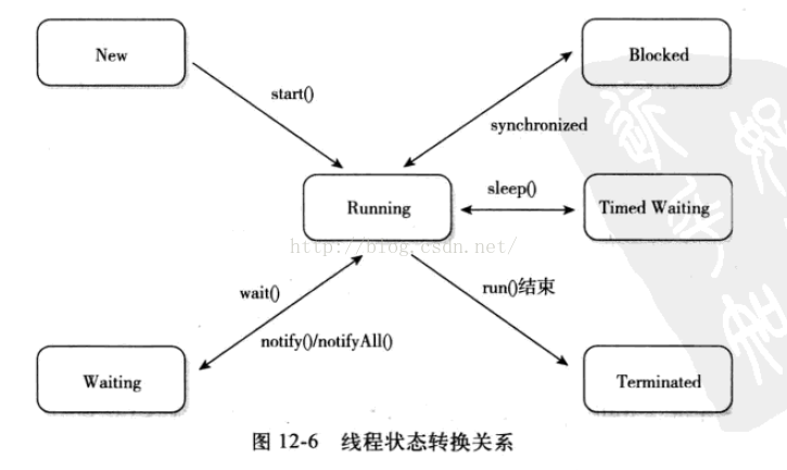 阻塞(Blocked):线程被阻塞了,“阻塞状态”与“等待状态”的区别是:“阻塞状态”在等待着获取一个排他锁,这个事件将在另外一个线程放弃这个锁的时候发生。