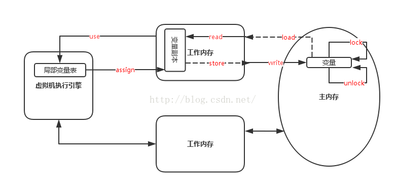 load(载入):作用于工作内存的变量,它把read操作从主内存中得到的变量值放入工作内存的变量副本中。
