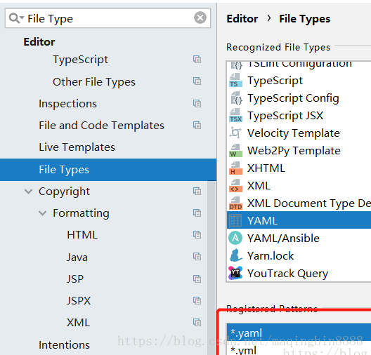 2.再Settings中找到File Types然后找YAML看看是否有yml后缀名