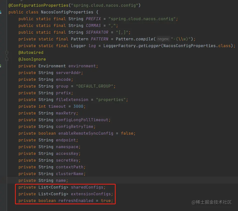 具体的配置类是NacosConfigProperties:
