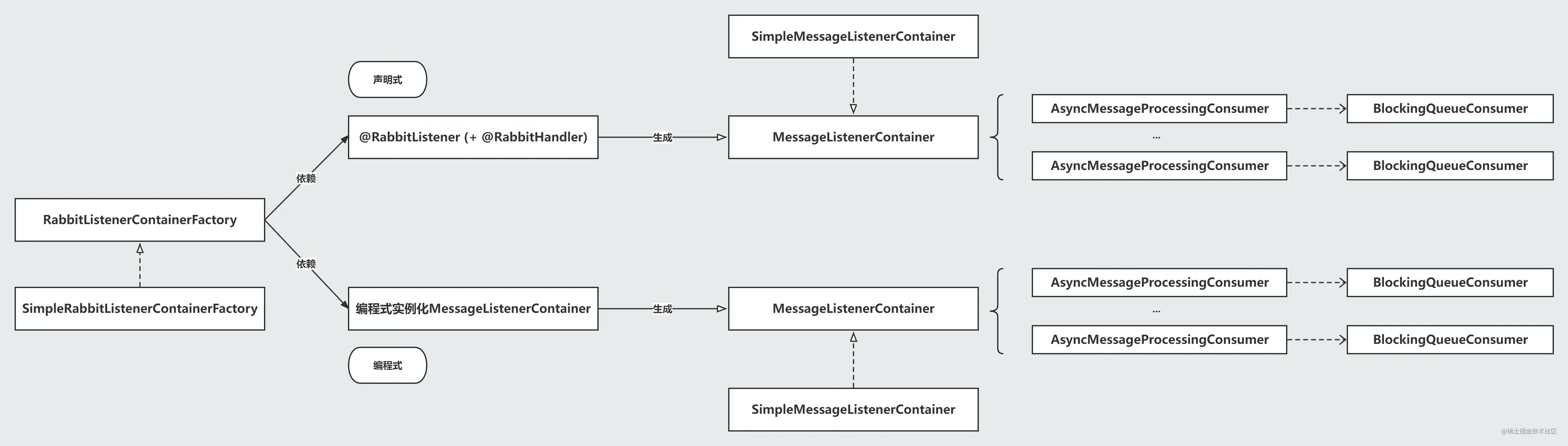 amqp中默认启用spring.rabbitmq.listener.type=simple,使用的RabbitListenerContainerFactory(消息监听器容器工厂)实现为SimpleRabbitListenerContainerFactory,使用的MessageListenerContainer(消息监听器容器)实现为SimpleMessageListenerContainer。在amqp中,无论注解声明式或者编程式注册的消费者最终都会封装为MessageListenerContainer实例,因此消费者生命周期可以直接通过MessageListenerContainer进行管理,MessageListenerContainer的生命周期管理API会直接作用于最底层的真实消费者实现BlockingQueueConsumer。几者的关系如下: