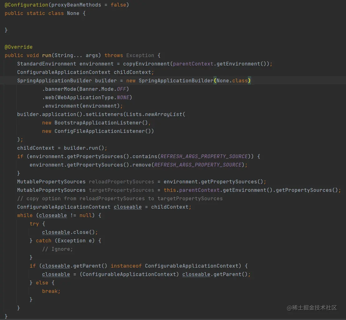 另外,如果细心的话能够观察到服务日志中,每当监听到Nacos配置变动会打印Started application in N seconds (JVM running for M)的日志,这个并不是服务重启了,而是启动了一个Spring子容器用于构建一个全新的StandardEnvironment(见文末Demo项目中的EnvironmentCaptureApplicationRunner)用来承载刷新后的配置文件内容,然后再拷贝或者覆盖到当前的Spring容器中的PropertySources,这个过程的代码实现类似这样:
