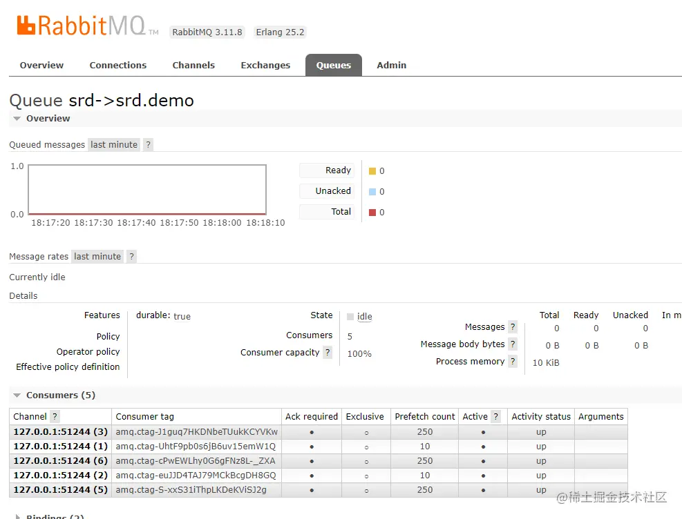 启动项目,观察RabbitMQ WebUI对应的队列消费者数量: