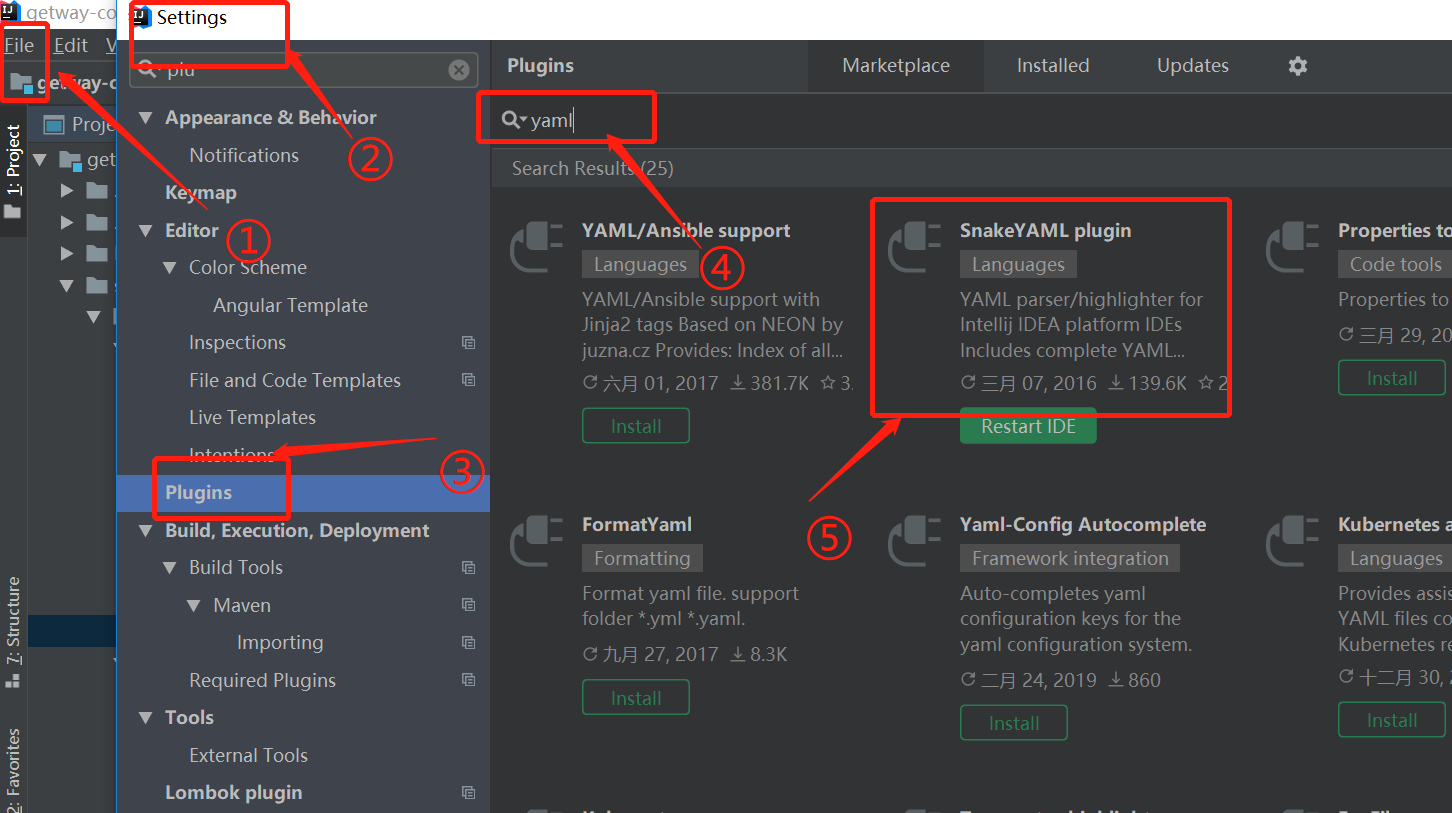 方案二:idea工具打开file-settings-plugins中搜索yaml。安装yaml插件也可以