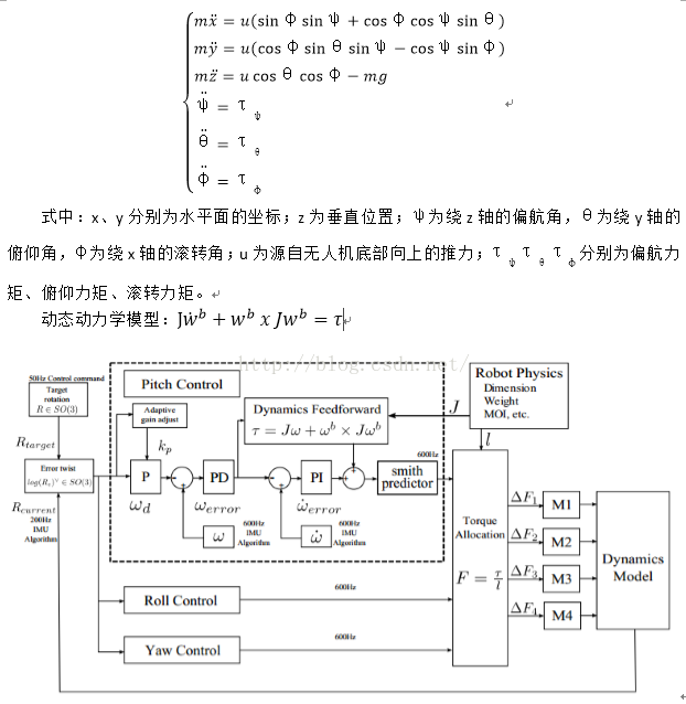 以四旋翼飞行器为例,主要就是通过改变旋翼的角速度来控制四旋翼无人机。每个旋翼产生一个推力(F1、F2、F3、F4)和一个力矩,其共同作用构成四旋翼无人机的主推力、偏航力矩、俯仰力矩和滚转力矩。在四旋翼无人机中,正对的一对旋翼旋转方向一致,另外一对与之相反,来抵消静态平稳飞行时的回转效应和气动力矩。升降以及RPY的实现不在赘述。控制对象就是四旋翼无人机,其动力学模型可以描述为:将其视为有一个力和三个力矩的三维刚体。如下给出了小角度变化条件下的四旋翼无人机的近似动力学模型: