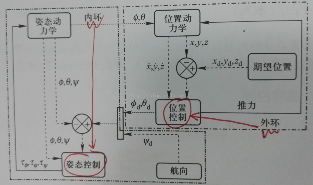 下图阐释了PX4源码中的两个环路控制,分为姿态控制和位置控制。