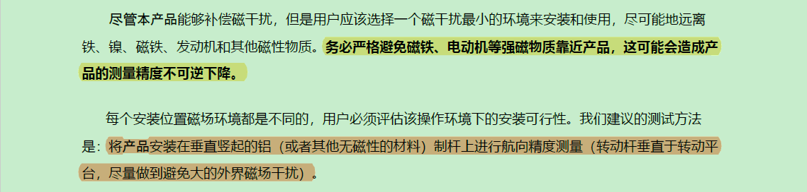 磁场问题,由于磁力计的存在,四元数解算有磁力计的修整,尤其是航向角,需要磁力计来修正。总之避免磁场是唯一的方式(室内磁场很弱,微小的磁干扰就会导致航向角失灵),在裸调之前,一切非常稳定,解算精准。但是开始装机后,出现磁干扰问题,以及是室内实验,于是切记切记。对于想使用航向角的人而言,不要寄希望于自己解算加速度计与陀螺仪数据来获得相对航向角,你会面临算法滤波等等方式来消除零漂(加计无法对航向角修正,例文)。