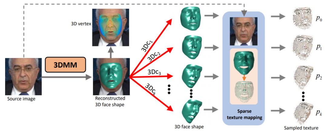 给定一张源人脸图像(Source Face),其3D形状可以通过改变重建的3DMM系数来进行任意的修改, 则目标人脸的稀疏纹理可以由修改后的3DMM系数获得。